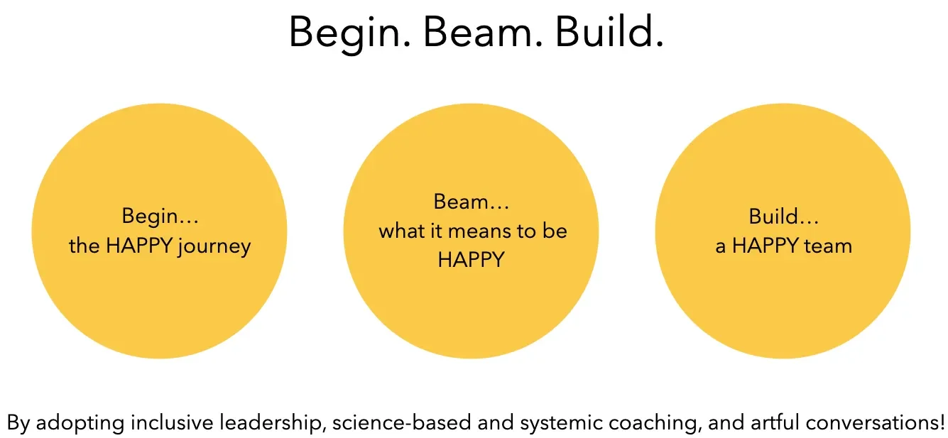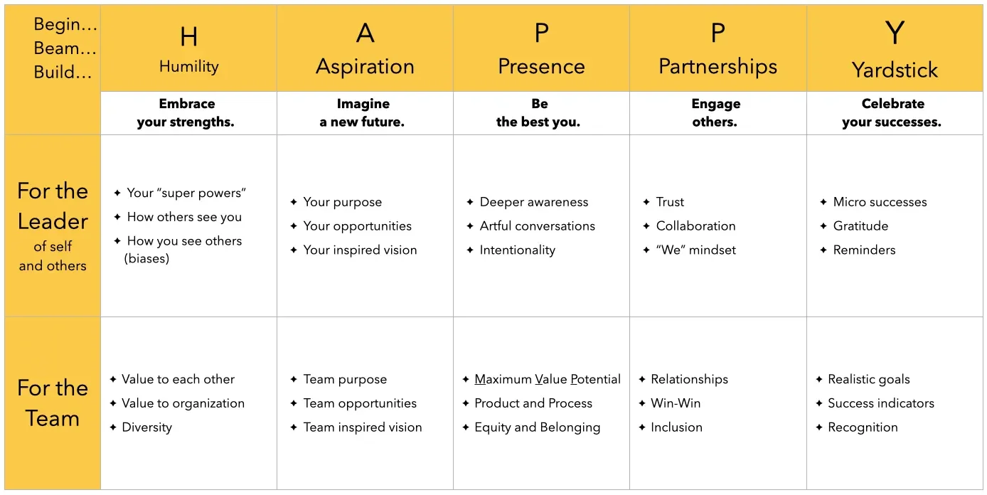 Each step along the HAPPY journey is a personal one, based on your and your team’s unique sense of Humility, Aspiration, Presence, Partnerships, and Yardstick elements at a point in time.